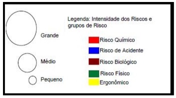 O tamanho dos círculos varia de acordo com o tamanho do risco no local sendo, riscos: pequeno, médio e grande.