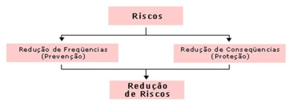 Redução do risco: Considerando que o risco é uma função da frequência de ocorrência dos possíveis acidentes e dos danos (consequências) gerados por esses eventos indesejados, a redução dos riscos numa instalação ou atividade perigosa pode ser conseguida por meio da implementação de medidas que visem tanto reduzir as frequências de ocorrência dos acidentes (ações preventivas), como as suas respectivas consequências (ações de proteção), conforme apresentado na figura: